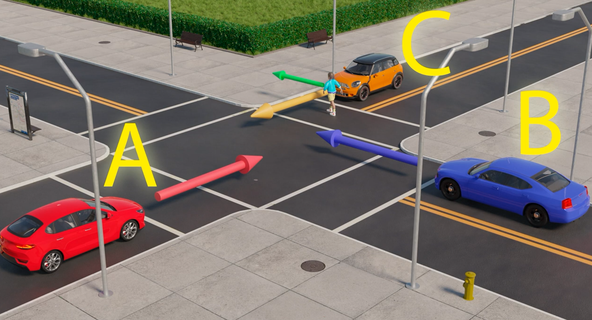 Na neoznačenej križovatke bez semaforov a dopravných značiek sa zišli tri autá. Každé z nich cez ňu prechádza rovno. Kto teda prejde cez cestu ako prvý? „Máte desať sekúnd na to, aby ste si to premysleli,“ odpočítava inštruktor.