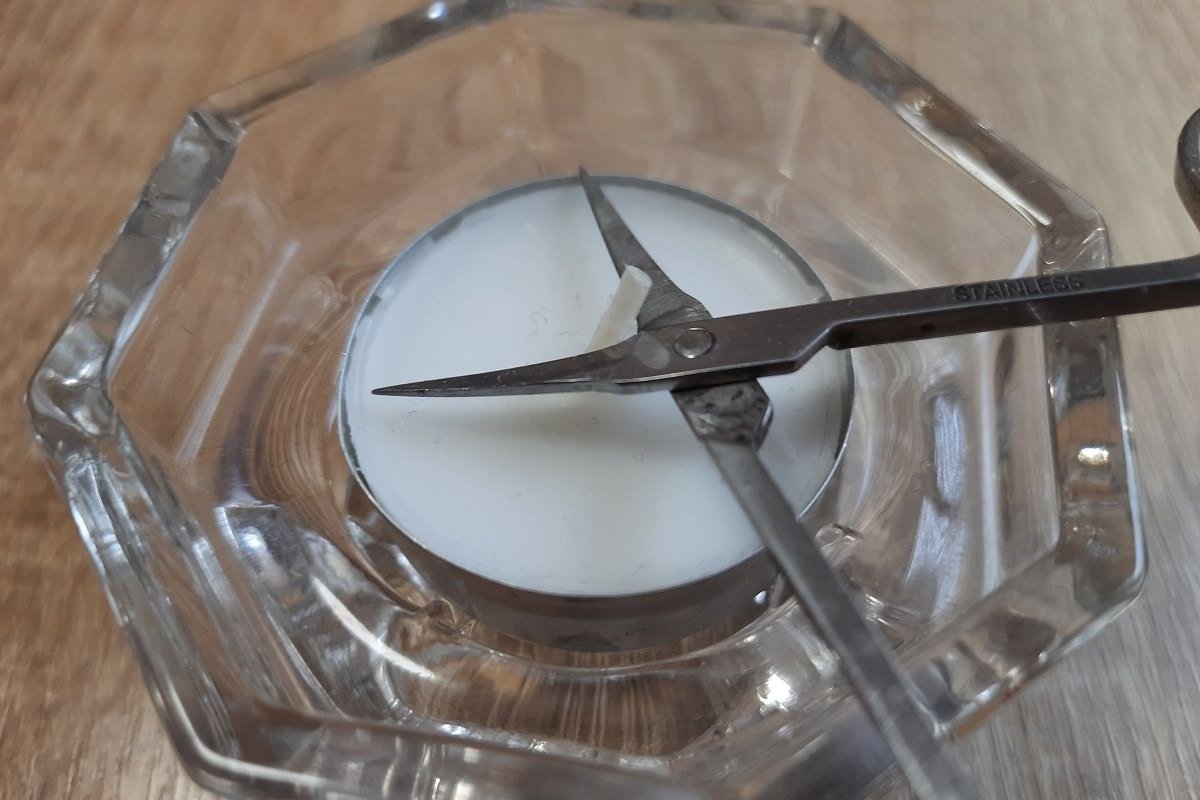 skráťte knôt na 5–10 mm – kratší plameň zabezpečí pomalšie spaľovanie vosku a menej sadzí,
