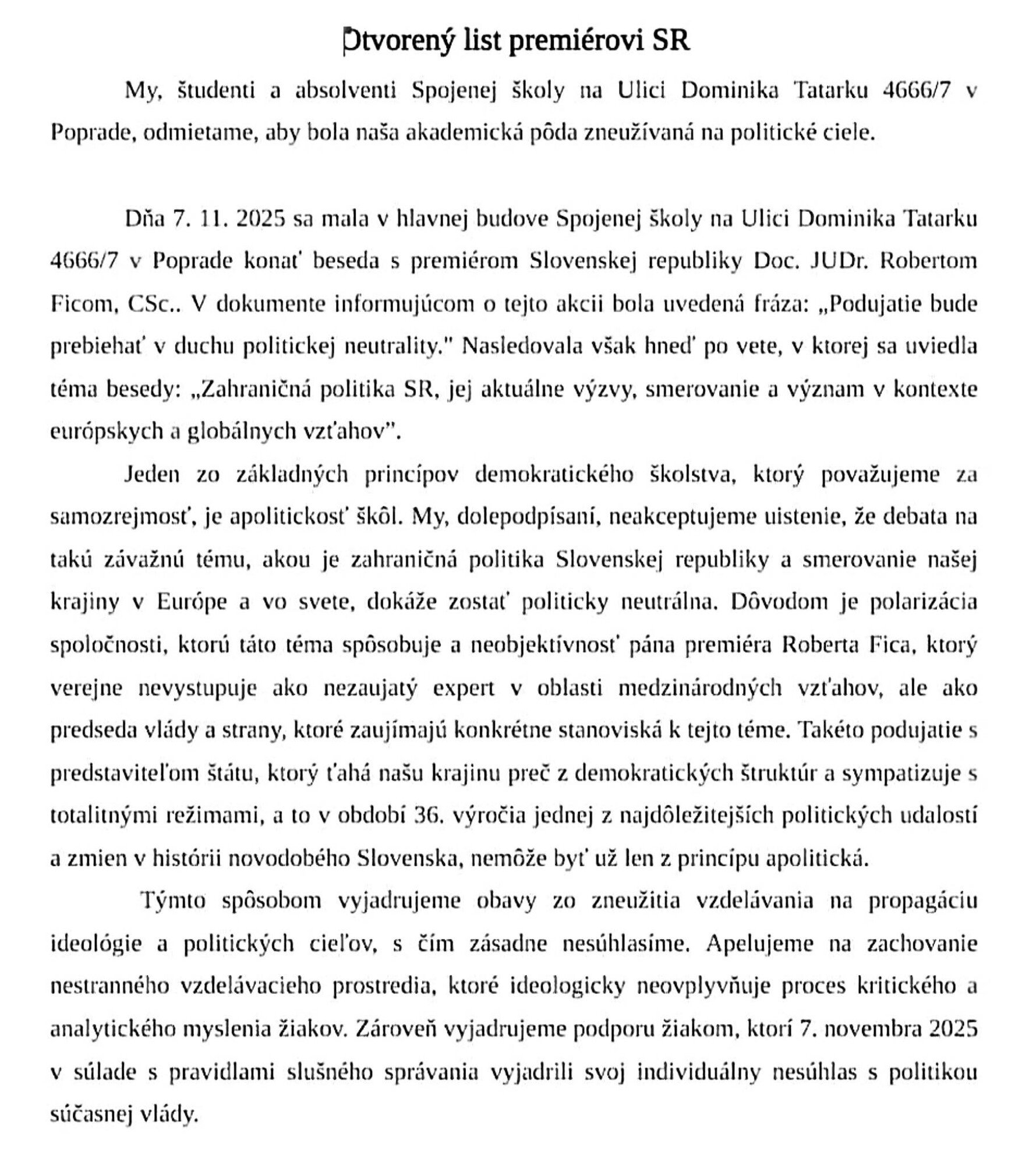 Apelujú preto na zachovanie nestranného a slobodného prostredia vo vzdelávaní – takého, ktoré podporuje rešpekt, pluralitu názorov a občiansku zodpovednosť. Podľa nich len spoločnosť, ktorá si váži slobodu slova a demokratické hodnoty, môže napredovať a vychovávať generáciu schopnú čeliť výzvam budúcnosti.