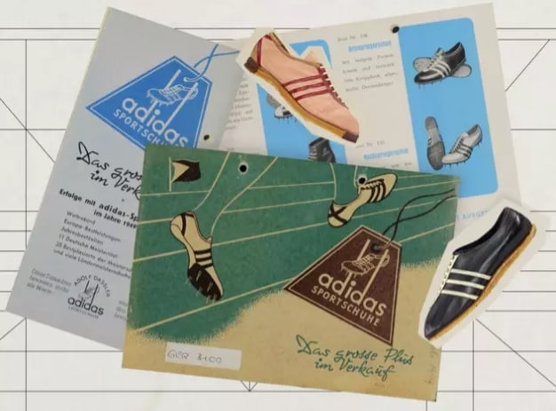 V tom čase sa Adidas sústredil najmä na výrobu športovej obuvi, a preto prvé logo značky zobrazovalo tretru s hrotmi, umiestnenú medzi predĺženými písmenami „d“ v názve Adidas – pripomínajúc bránku. Samozrejme, topánka už od začiatku niesla charakteristické tri pruhy, čo značí, že tento prvok bol kľúčový pre každý produkt.