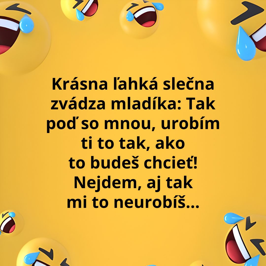 Vtip o tom, ako mladík nechcel pristúpiť na ponuku ľahkej slečny, pretože neveril, že mu to spraví podľa jeho predstáv.