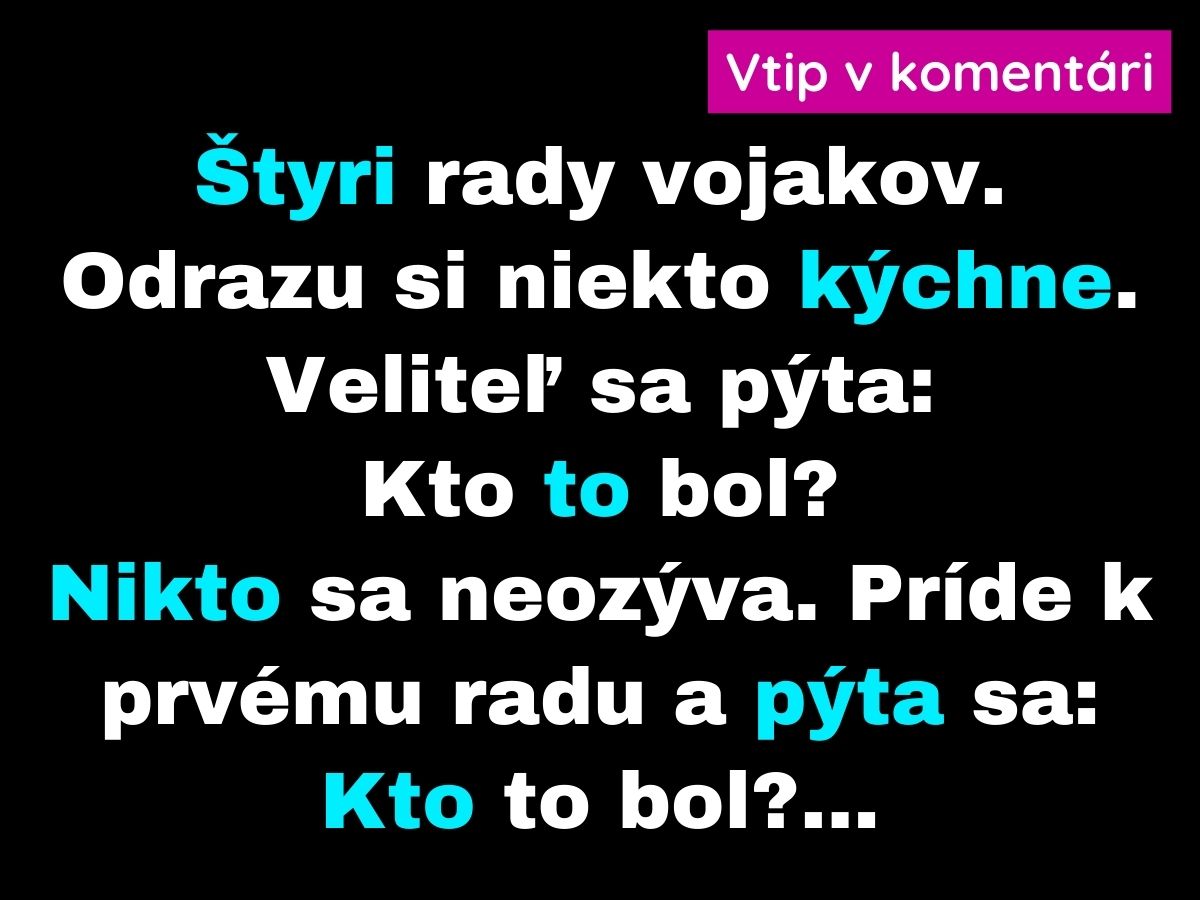 Vtip o tom, ako sa veliteľ rázne pýta všetkých vojakov, kto z nich si kýchol.