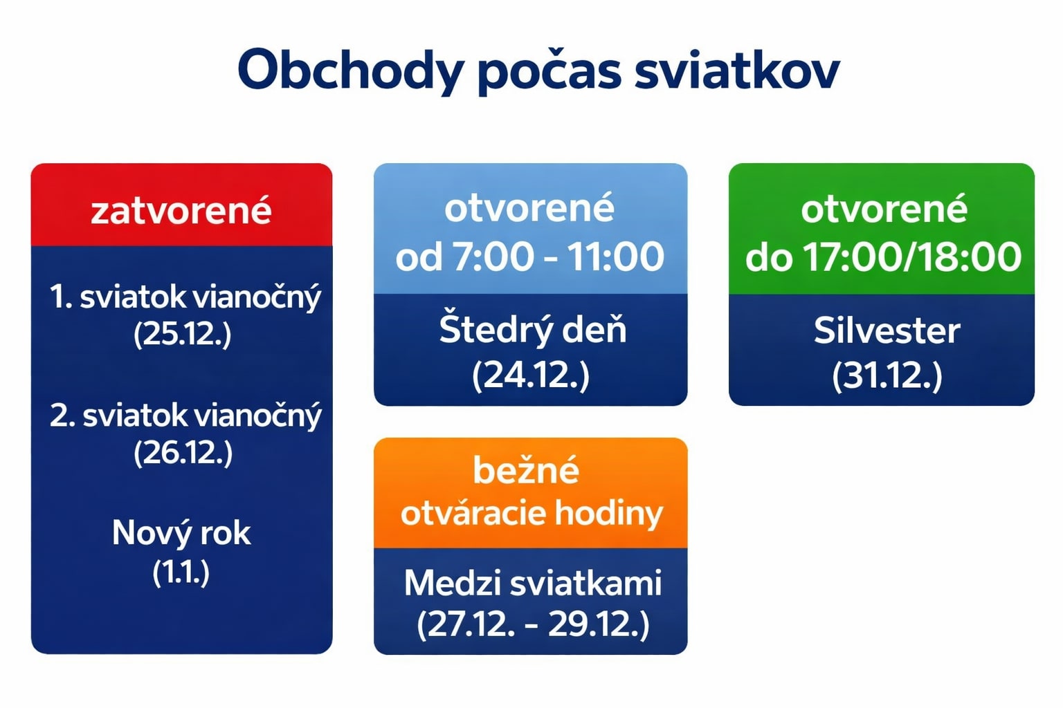 Poslednú možnosť doplniť chýbajúce potraviny či darčeky ponúkne Štedrý deň. Vtedy budú predajne otvorené od 7.00 do 11.00 hodiny dopoludnia. Ide o dlhoročnú prax obchodných reťazcov, ktorá má zabezpečiť, aby sa zamestnanci mohli včas venovať rodinným sviatkom. Predajne opäť privítajú zákazníkov v sobotu 27. decembra.
